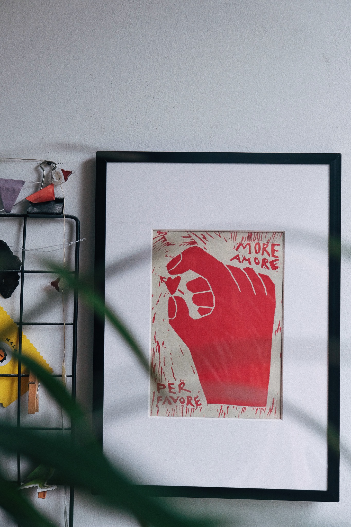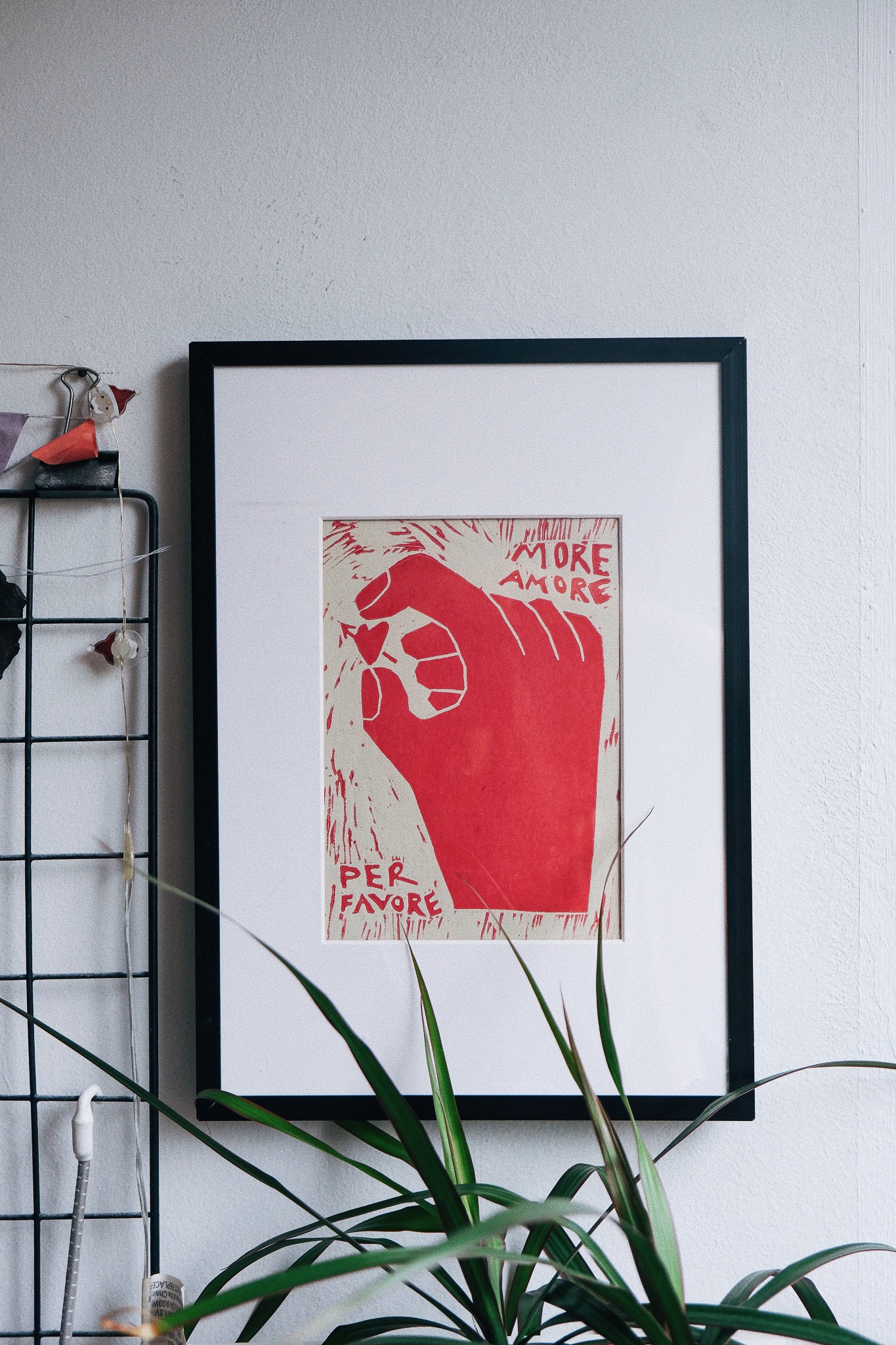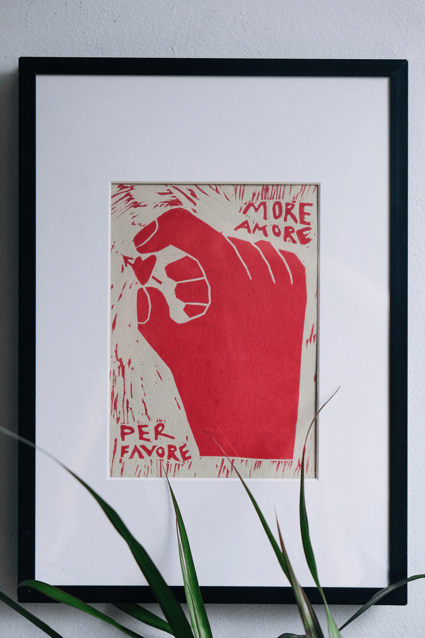 Amore Print je ročno izdelana grafika v tehniki linoreza, ki v prostor prinaša toplino, strast in opomin, da ljubezni nikoli ni preveč. Vsak odtis je unikatno ročno delo, ustvarjen z rdečo barvo na kakovostnem papirju, kar grafiki podari pristen, organski značaj.
