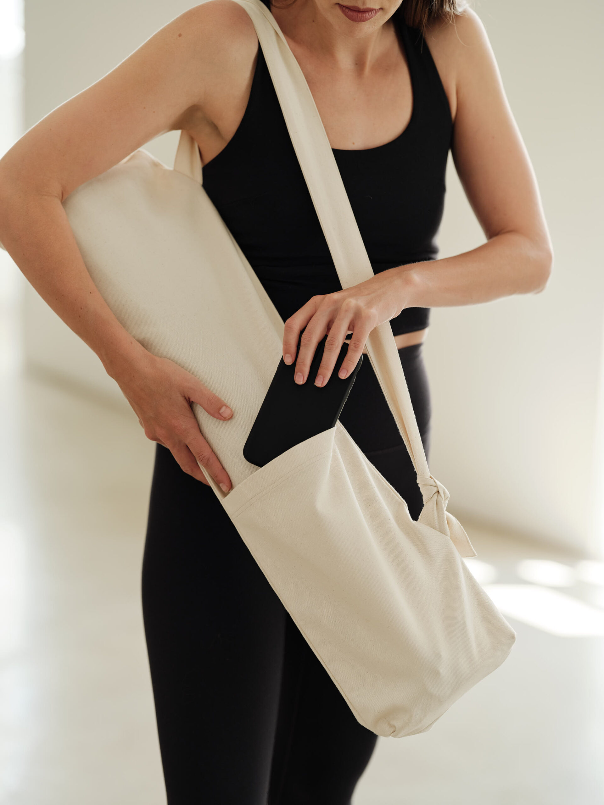 Joga torba Tula je zasnovana kot preprost in lahek tulec za joga podlogo, ki jo zanesljivo objame. Visok zunanji žep omogoča varno shranjevanje telefona, ključev in drugih nujnih potrebščin. Zaradi prilagodljive višine je primerna za vse tipe joga podlog, nastavljiva naramnica pa omogoča udobno nošenje preko rame, prečno čez prsi ali v roki.