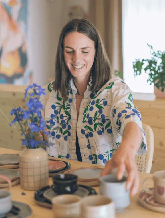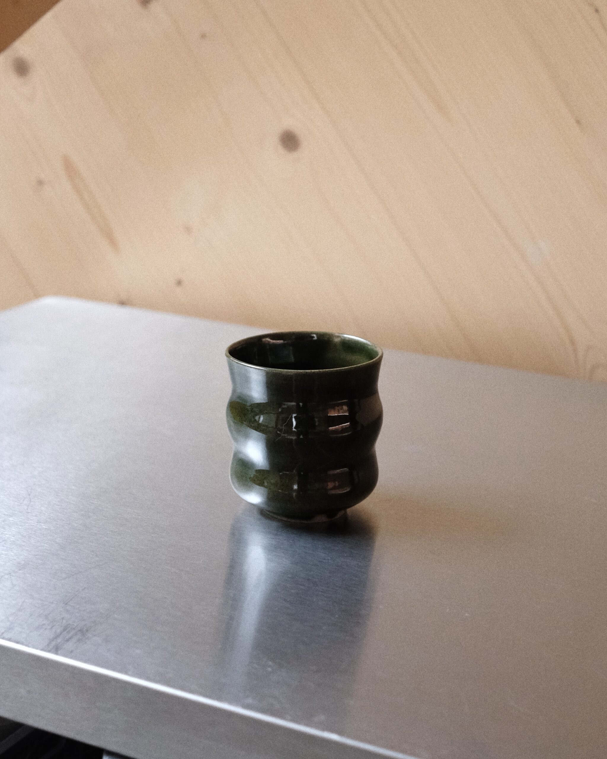 Skodelica je delo slovenske ustvarjalke Janže (JNŽ), ki v svojem studiu ustvarja unikatne kose iz kamenine (stoneware). Vsak kos je ročno oblikovan, kar skodelici podari značilno valovito teksturo, ki se popolnoma prilega dlani.