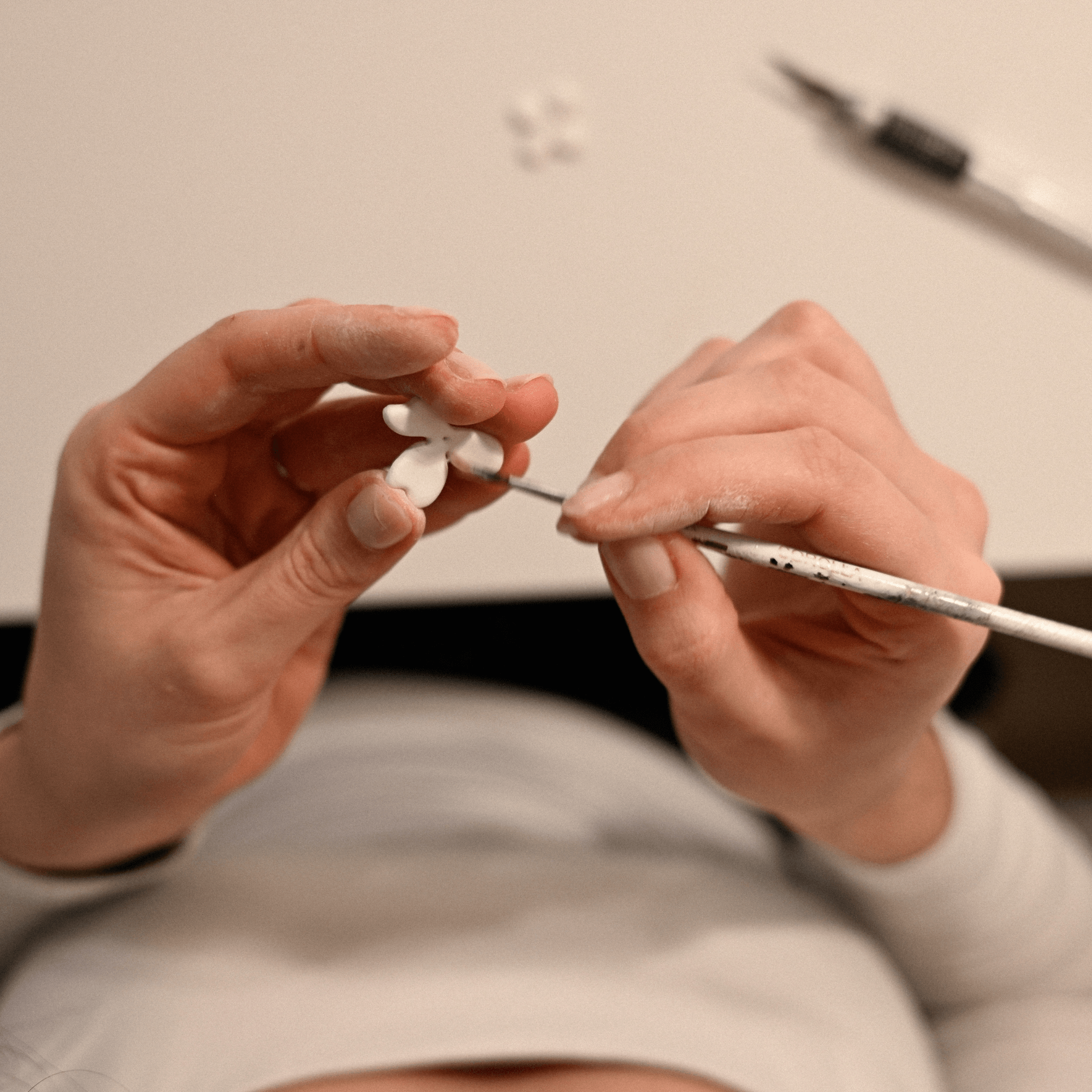Pomladne cvetlice, ujete v porcelanu, so delo Marjane iz Gudi studia. Vsak par je ročno izdelan in zato unikaten v obliki ter detajlih. Porcelan nakitu doda lahkotnost, prefinjenost in občutek trajnosti, ki presega trenutne trende. Uhani so prijazni do kože saj so brez niklja.
